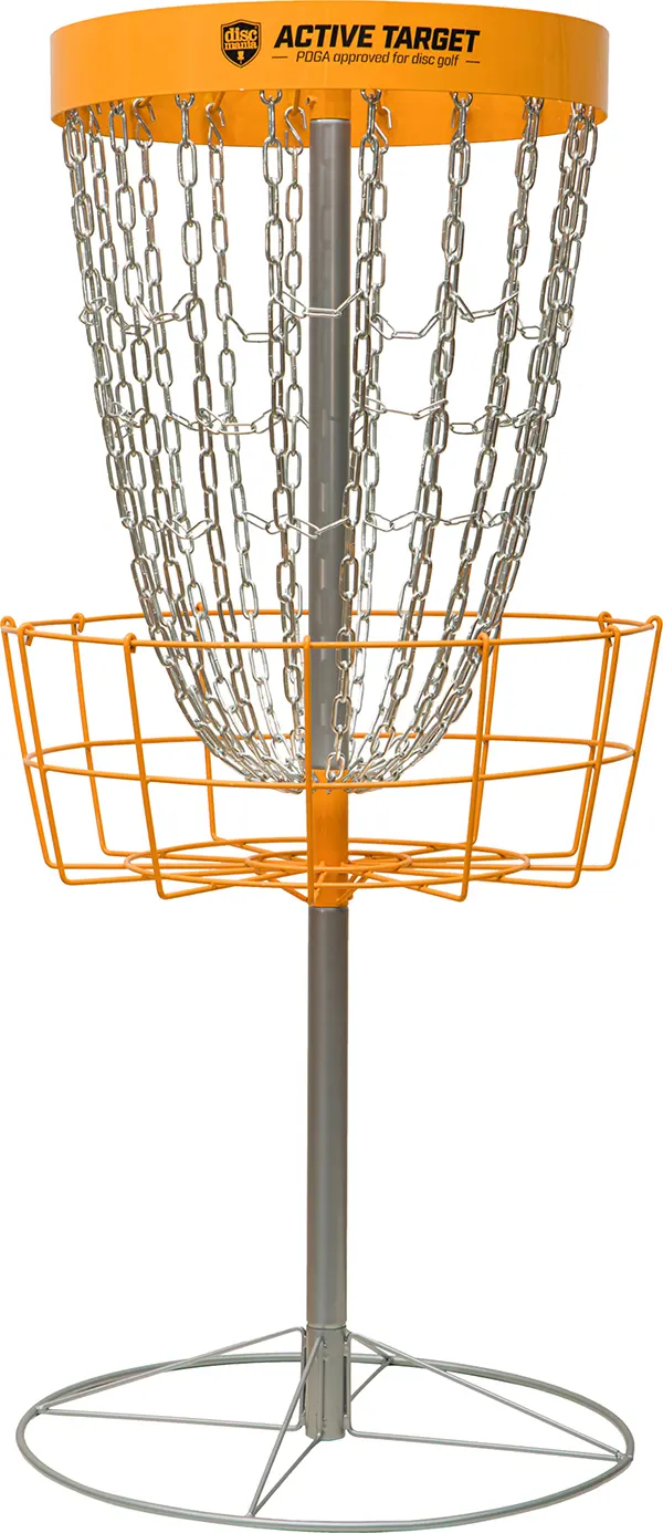 The Discmania Active Target is a great looking portable target. It has a high visibility yellow band and cage, so you can easily locate the target even in dark conditions. It’s approved by the Professional Disc Golf Association. It’s designed for practice, both outdoor and indoor. Like all practice targets, we recommend this target to be stored indoors after use.